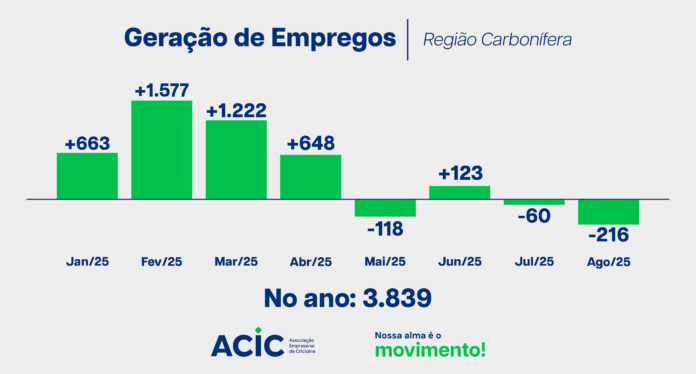 Em agosto, Criciúma registrou saldo de -158 vagas, enquanto a Região Carbonífera encerrou o mês com -216 empregos. Entre os municípios, o destaque positivo foi Balneário Rincão, que gerou 35 novas vagas formais no período.